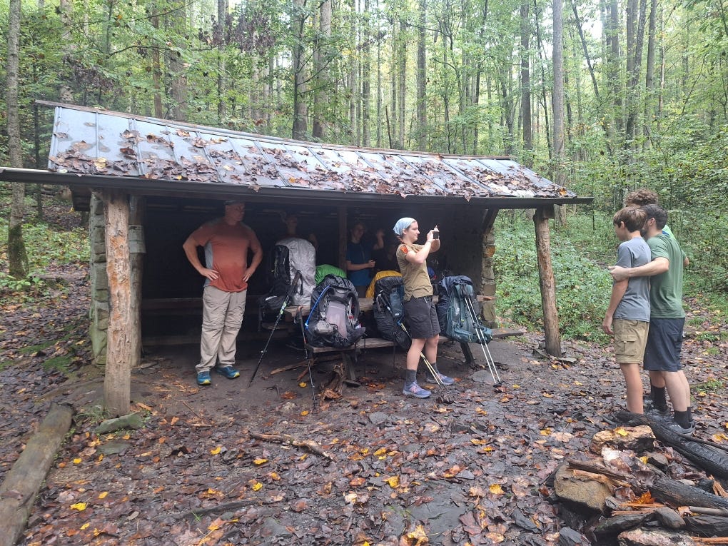 As I said, they left around 4:30 a.m. yesterday. They drove up to their start point, unloaded the gear and most of the people, and then sent one dad to deposit the van at their endpoint. They hiked around seven miles to their first shelter, and the third dad got a ride back and rejoined them at midnight. The “conditioning hikes” we took as a family these past few weeks have paid off, it seems. Wayne was constantly pushing himself, using hiking poles to see if his arms would be able to bear that weight, flexing his hands and fingers, adding a little weight to his back. He texted me a few pictures this morning and said that it was rainy, and that his legs are very tired, but he’s making it.